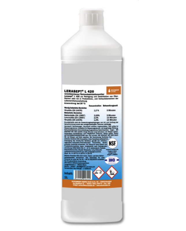 Lerasept® L 420 je přípravek ze čtyřkových sloučenin amoniaku a neionických tenzidů určený k dezinfekci povrchů všeho druhu ve výrobních a prodejních prostorech v potravinářském průmyslu.