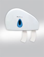 vyrobený z vysoce kvalitního plastu ABS bílé barvy vybavený průhledným plastovým průzorem umožňujícím kontrolu množství papíru v zásobníku, v barvě modréna toaletní papír o max. průměru role 23 cm uzamykatelný na klíček