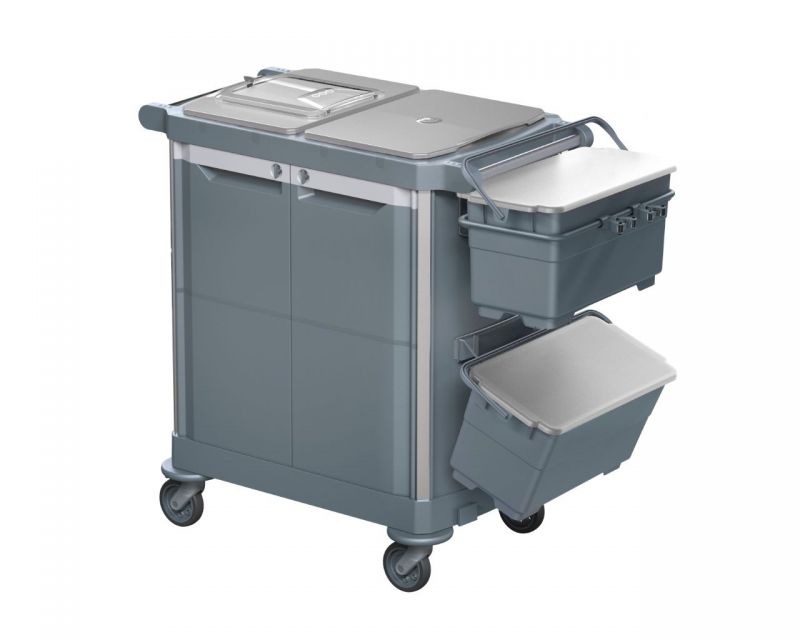Úklidový servisní vozík MERIDA, šedý, 2x22 l box s víkem, 3x7 l vědra, 2x70 l na odpadkové pytle